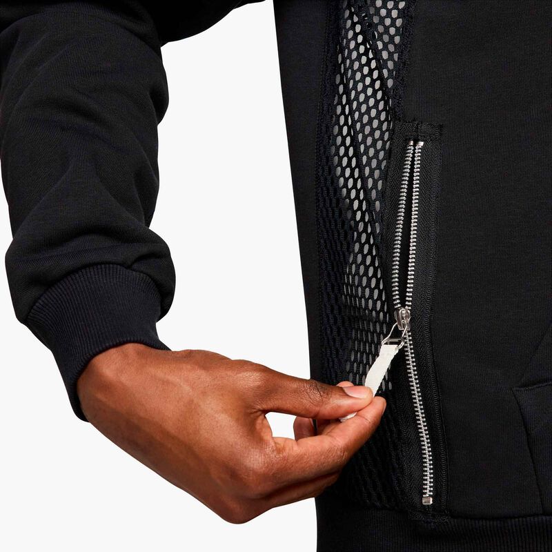 La tela French Terry de densidad media, con bucles sin cepillar en el interior, ofrece transpirabilidad, suavidad y algo de elasticidad, haciéndola tan adecuada para el gimnasio como para el sofá. Los paneles de malla laterales proporcionan una mayor ventilación.